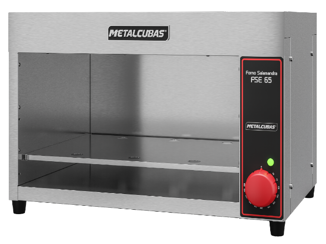 gerada por uma resistência elétrica. Fabricado internamente e externamente em aço inox 430, com isolamento térmico feito em lã de rocha que mantem o calor concentrado na parte interna do forno. Controle de temperatura é feito manualmente por um  termostato de 50° a 300° que permite um controle mais preciso da temperatura interna. Regulagem de altura permite aproximar ou afastar o alimento da resistência.