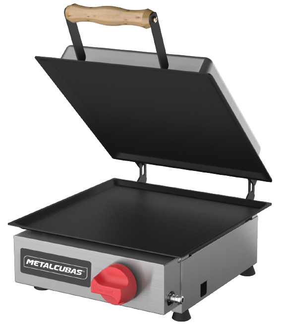 Base superior e base inferior em aço carbono SAE 1020 de 2,0 mm estampado, estrutura em aço inox 430 escovado, queimadores aço carbono e pés de borracha anti derrapante em com regulagem