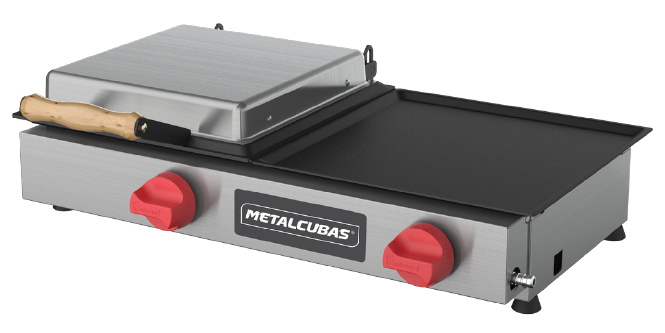Base superior e base inferior em aço carbono SAE 1020 de 2,0 mm estampado, estrutura em aço inox 430 escovado, queimadores aço carbono e pés de borracha anti derrapante em com regulagem.